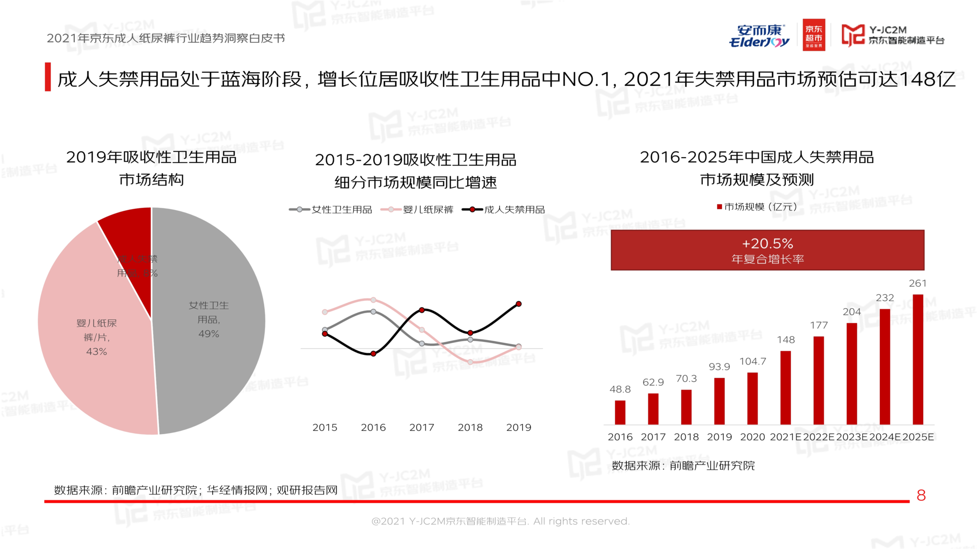 通过《2021年京东成人纸尿裤行业趋势洞察白皮书》的解读,我们不难发现,相较于历经多年发展、已接近或达到成熟期的婴儿护理用品和女性卫生用品行业,国内成人失禁用品行业现在刚刚开始步入成长通道,未来将成长为高增长赛道。综合消费升级趋势下的市场扩容、消费者教育后品牌认知提升等因素的作用,同时伴随养老服务制度在我国的完善,以及成人失禁护理相关福利政策的陆续出台,未来我国成人失禁用品机构渠道与个人需求增长将不断提速,而以3499拉斯维加斯集团旗下安而康品牌为代表的国货更将有望凭借产品和先发优势继续领跑。